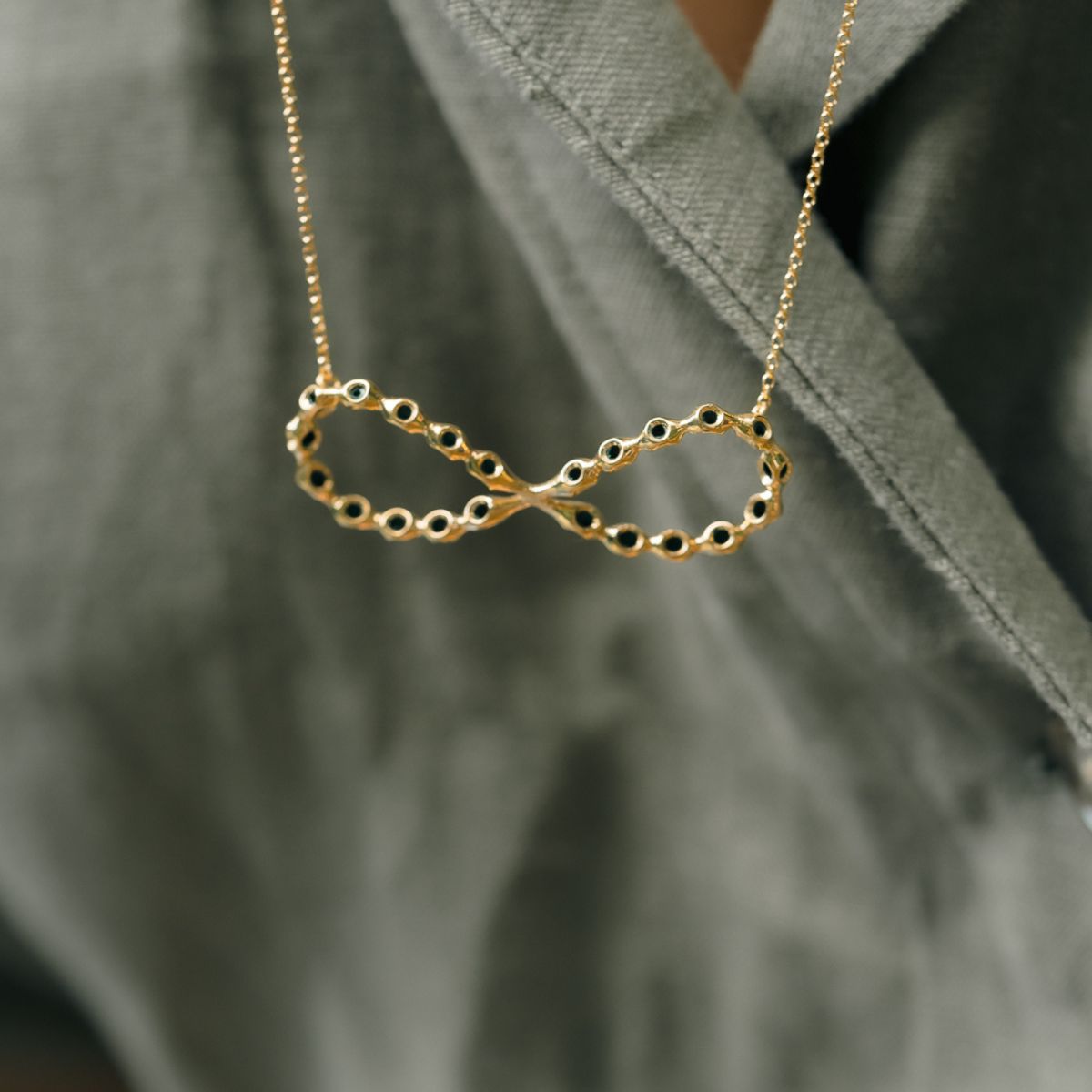 The Infinito collection is inspired by the simple, boundless existence of love—ever-present in countless forms. The Infinito Teeny Pendant features a delicate, small infinite symbol, gently held by a repeated sequence of our iconic Huritá sphere, placed at the heart of a fine chain, offering a subtle yet profound statement of endless love.