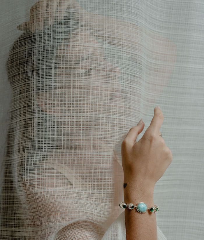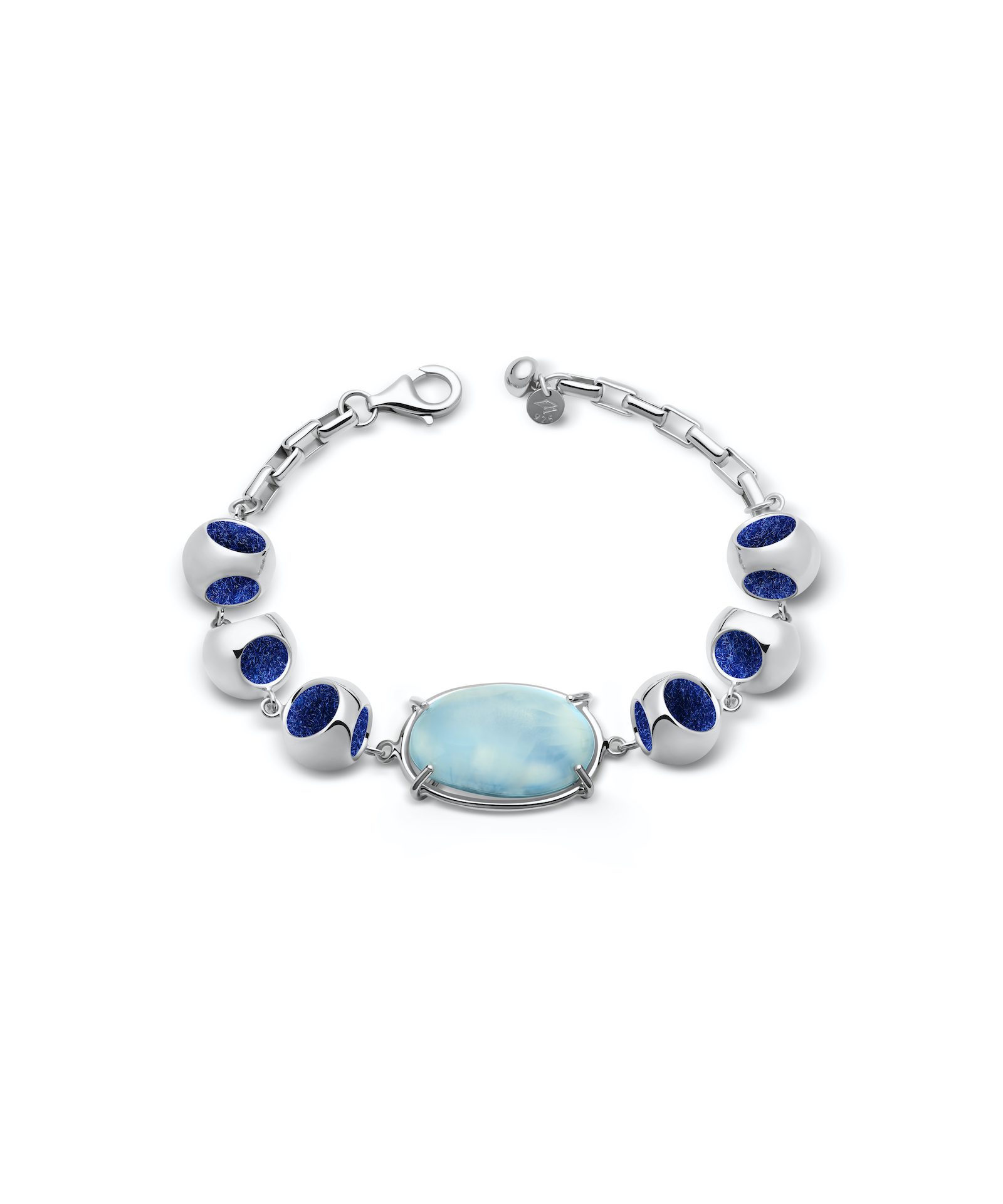 Monica Varela Jewelry empowers the opulent artwear seeker with cutting-edge designs infused by an evolving imagination, abstract art, and national semi precious gemstones. Ethically handcrafted by artisans in the Dominican Republic with an elevated blend of traditional jewelry techniques and sustainably sourced materials. Infinity Petite Larimar Pulsera