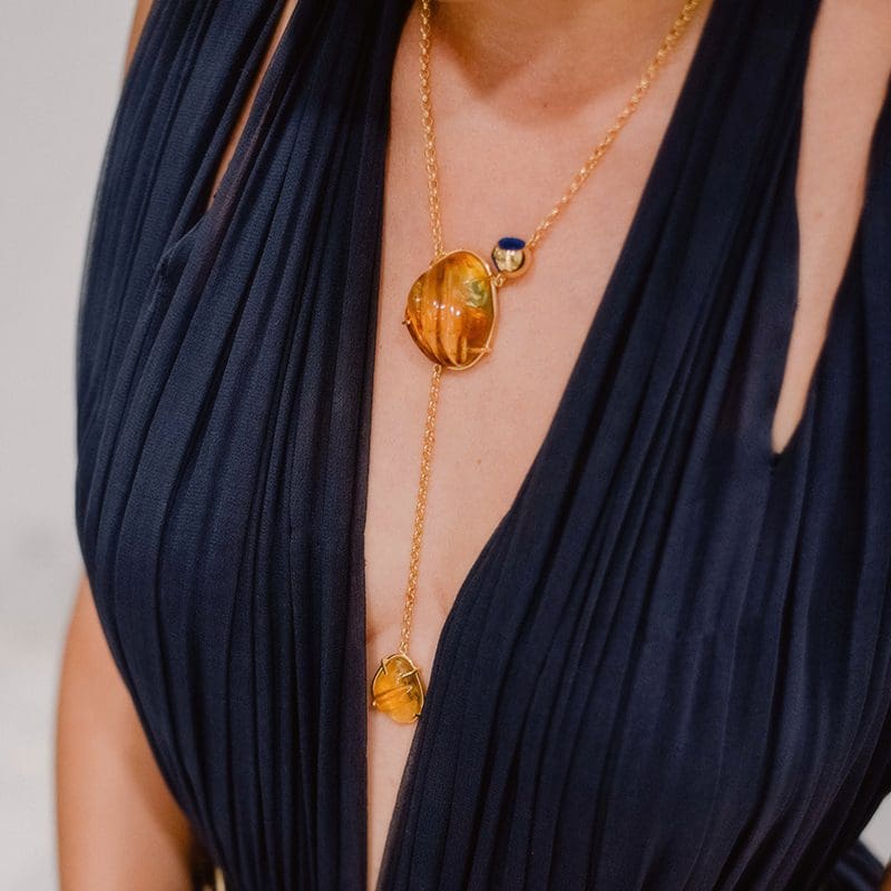 Monica Varela Jewelry empowers the opulent artwear seeker with cutting-edge designs infused by an evolving imagination, abstract art, and national semi precious gemstones. Ethically handcrafted by artisans in the Dominican Republic with an elevated blend of traditional jewelry techniques and sustainably sourced materials. Petite Double Amber Pendiente