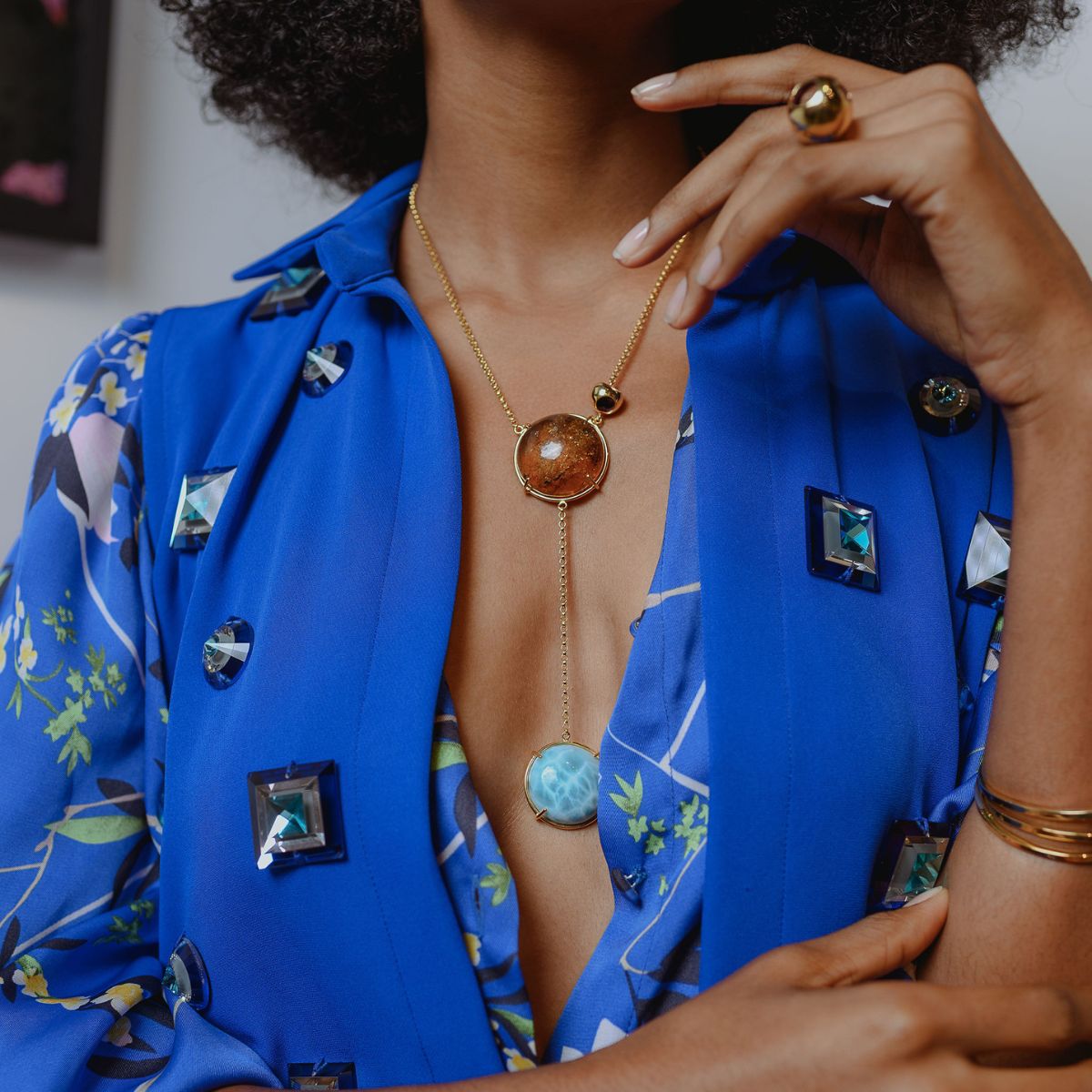 Monica Varela Jewelry empowers the opulent artwear seeker with cutting-edge designs infused by an evolving imagination, abstract art, and national semi precious gemstones. Ethically handcrafted by artisans in the Dominican Republic with an elevated blend of traditional jewelry techniques and sustainably sourced materials. Petite Double Larimar & Amber Pendiente