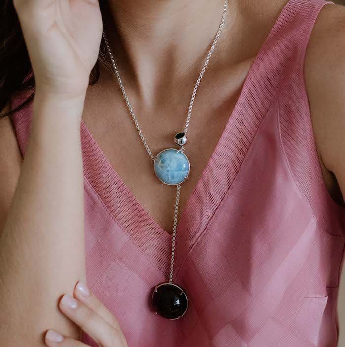 Monica Varela Jewelry empowers the opulent artwear seeker with cutting-edge designs infused by an evolving imagination, abstract art, and national semi precious gemstones. Ethically handcrafted by artisans in the Dominican Republic with an elevated blend of traditional jewelry techniques and sustainably sourced materials. Petite Double Larimar & Amber Pendiente