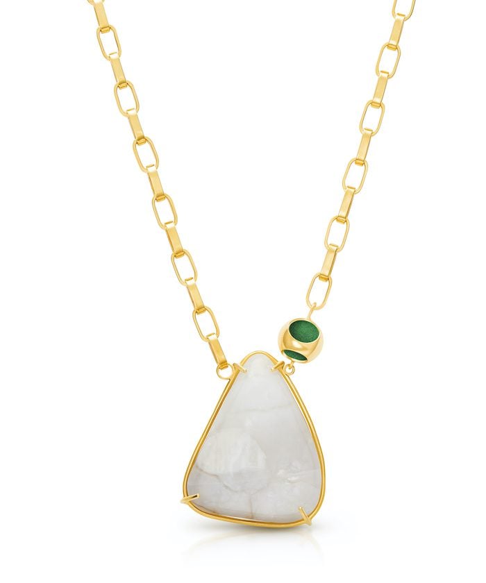 Monica Varela Jewelry empowers the opulent artwear seeker with cutting-edge designs infused by an evolving imagination, abstract art, and national semi precious gemstones. Ethically handcrafted by artisans in the Dominican Republic with an elevated blend of traditional jewelry techniques and sustainably sourced materials. Petite Piedra Luna Fancy Square Collar