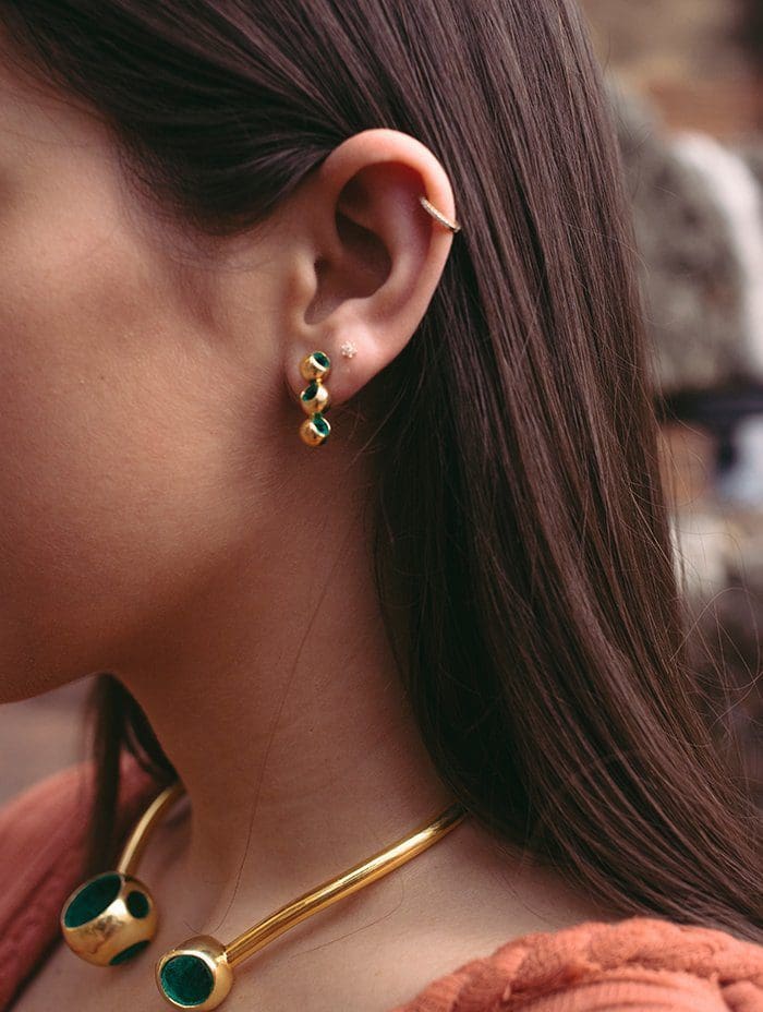 Monica Varela Jewelry empowers the opulent artwear seeker with cutting-edge designs infused by an evolving imagination and abstract art. Ethically handcrafted by artisans in the Dominican Republic with an elevated blend of traditional jewelry techniques and sustainably sourced materials. Trinity Mini Aretes